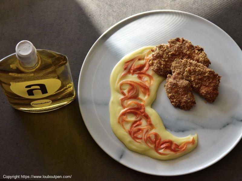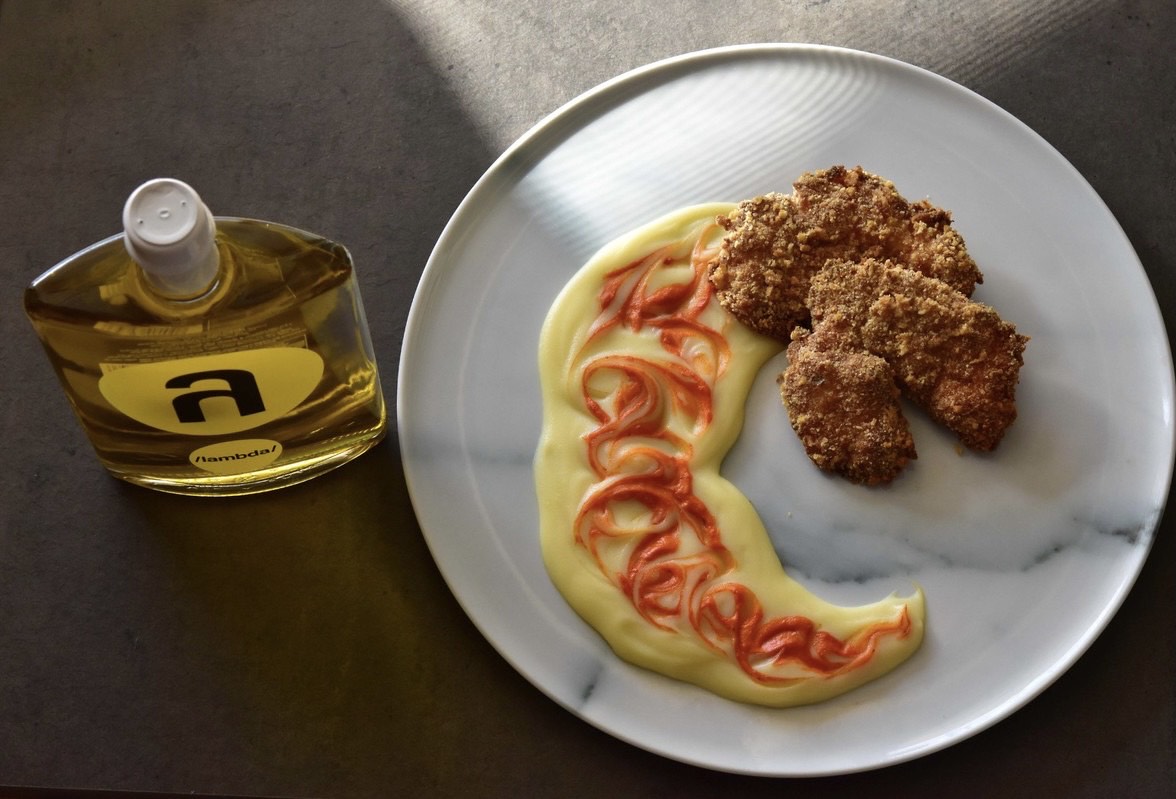 Ε λοιπόν, αυτό το φιλέτο κοτόπουλο, σχεδόν μαριναρισμένο στην πάστα πιπεριάς, παναρισμένο με φρυγανιά και ψημένο στον φούρνο με λ /lambda/ olive oil σε ελάχιστο χρόνο, σήμερα ζήτησε να το συνοδεύσει πουρές πατάτας.